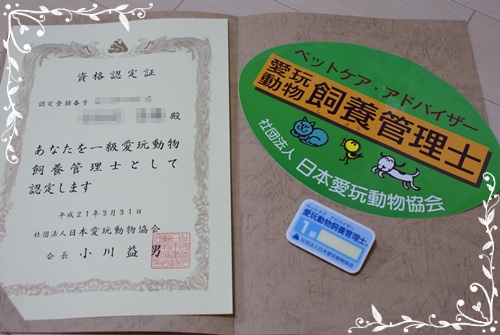 には番犬がんばってもらわないと(笑)さて先日、愛玩動物飼養管理士の証書などが届きました