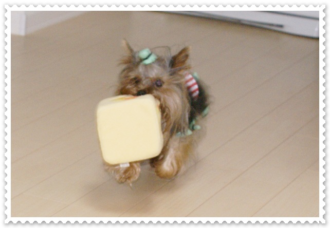 自分の顔より大きなおもちゃをくわえて走り回ってます